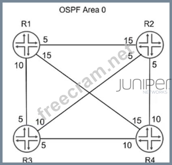 Exhibit. Referring to the exhibit, which path would traffic passing through R1 take to get to R4?