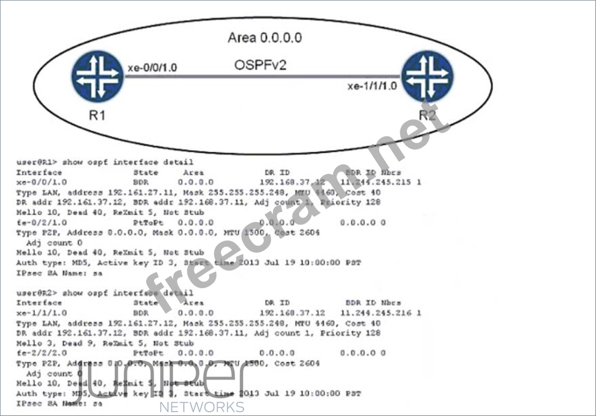 The hello interval is the time interval between two consecutive hello packets sent by an OSPF router on an interface. The dead interval is the time interval after which a neighbor is declared down if no hello packets are received from it. These parameters must match between two OSPF routers for them to form an adjacency. In the exhibit, router R1 has a hello interval of 10 seconds and a dead interval of 40 seconds, while router R2 has a hello interval of 30 seconds and a dead interval of 120 seconds. This causes a mismatch and prevents them from becoming neighbors23.