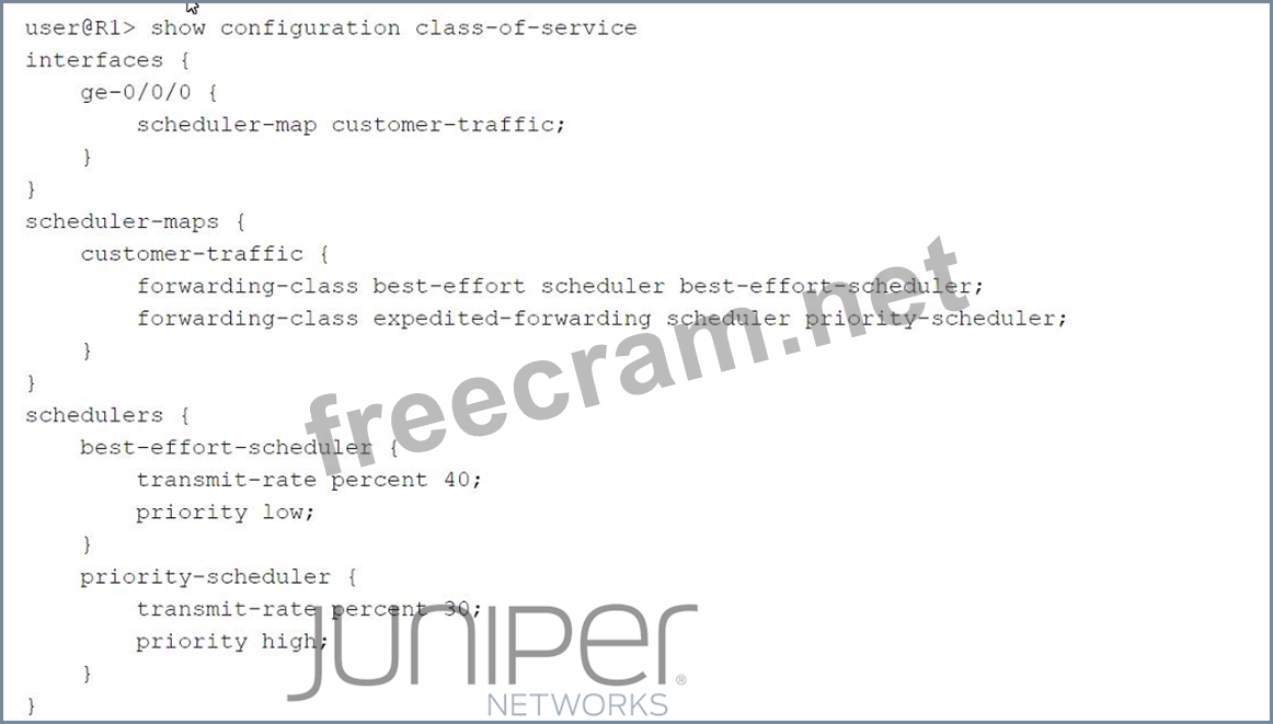 Which two statements are correct about the class-of-service configuration shown in the exhibit? (Choose two.)