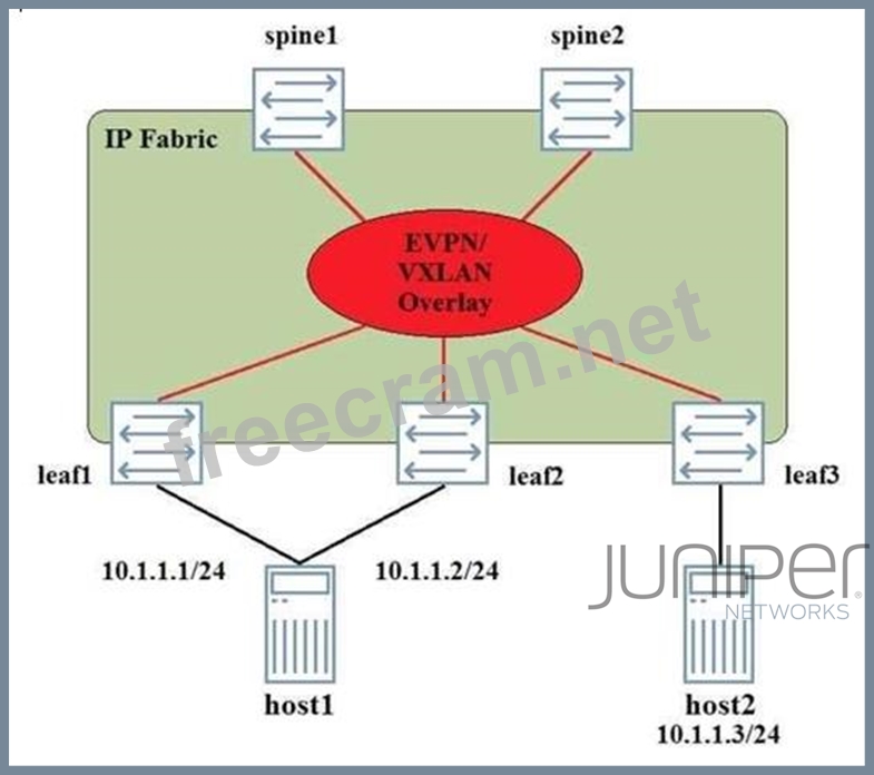 An EVPN-signaled VXLAN overlay has been deployed in the network shown in the exhibit. Host1 is a bare metal server, and is dual-homed to the network. The IP addresses 10.1.1.1/24 and 10.1.1.2/24 are assigned to the same physical NIC, and no virtualization is configured on the server.