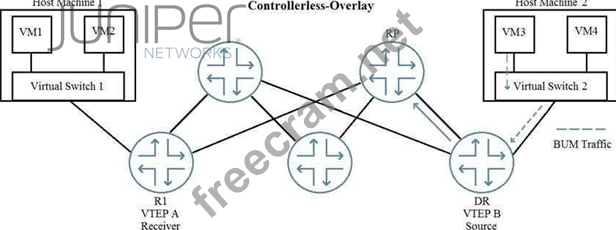 Question 16: In the exhibit, VM1 is part of the same VXLAN segment as VM3...