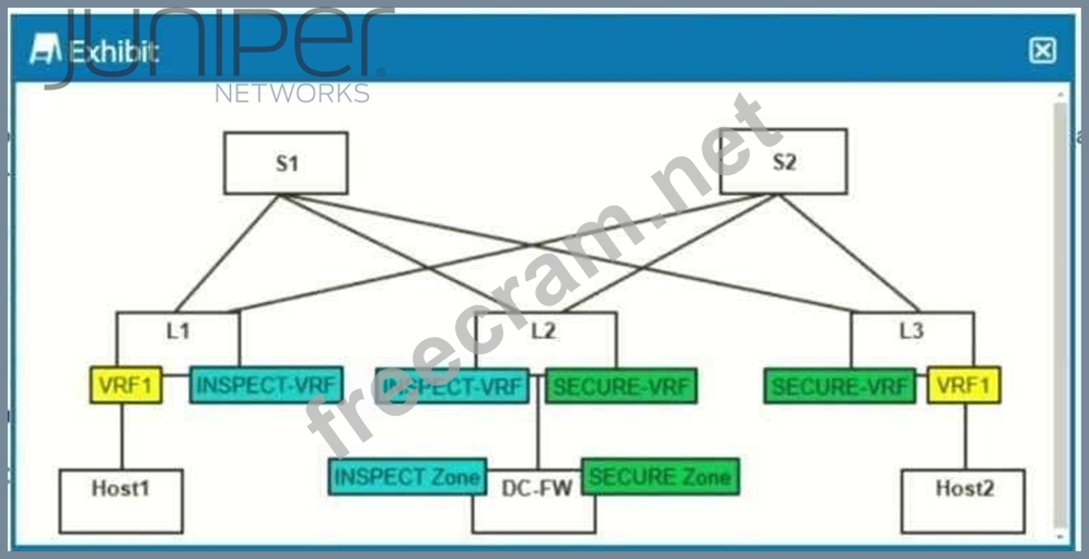 You are attempting to configure filter-based forwarding in your data center. All traffic from Host1 that is going to Host2 should be inspected by the data center firewall. You have verified that the traffic is being forwarded from router leaf L1's VRF-1 to its INSPECT-VRF. However, the traffic is not reaching service L2.