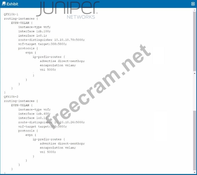Exhibit. You have a sample configuration for connecting two sites through EVPN-VXLAN by exchanging IP prefix routes. Referring to the exhibit, which two statements regarding the configuration are true? {Choose two.)