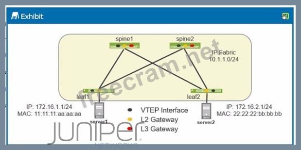 * Understanding the Exhibit Setup: * The network diagram shows an EVPN-VXLAN setup, a common design for modern data centers enabling Layer 2 and Layer 3 services over an IP fabric. * Leaf1 and Leaf2 are the leaf switches connected to Server1 and Server2, respectively, with each server in a different subnet (172.16.1.0/24 and 172.16.2.0/24). * Spine1 and Spine2 are part of the IP fabric, interconnecting the leaf switches. * EVPN-VXLAN Basics: * EVPN (Ethernet VPN) provides Layer 2 and Layer 3 VPN services using MP-BGP. * VXLAN (Virtual Extensible LAN) encapsulates Layer 2 frames into Layer 3 packets for transmission across an IP network. * VTEP (VXLAN Tunnel Endpoint) interfaces on leaf devices handle VXLAN encapsulation and decapsulation. * Integrated Routing and Bridging (IRB): * IRB interfaces are required on leaf1 and leaf2 (where the endpoints are directly connected) to route between different subnets (in this case, between 172.16.1.0/24 and 172.16.2.0/24). * The IRB interfaces provide the necessary L3 gateway functions for inter-subnet communication. * Traffic Flow Analysis: * Traffic from Server1 (172.16.1.1) destined for Server2 (172.16.2.1) must traverse from leaf1 to leaf2. * The traffic will be VXLAN encapsulated on leaf1, sent over the IP fabric, and decapsulated on leaf2. * Since the communication is between different subnets, the IRB interfaces on leaf1 and leaf2 are crucial for routing the traffic correctly. * Correct Statements: * C. An IRB Interface must be configured on leaf1 and leaf2:This is necessary to perform the inter-subnet routing for traffic between Server1 and Server2. * D. Traffic from server1 to server2 will transit the VXLAN tunnel between leaf1 and leaf2: This describes the correct VXLAN operation where the traffic is encapsulated by leaf1 and decapsulated by leaf2. Data Center References: * In EVPN-VXLAN architectures, the leaf switches often handle both Layer 2 switching and Layer 3 routing via IRB interfaces. This allows for efficient routing within the data center fabric without the need to involve the spine switches for every routing decision. * The described traffic flow aligns with standard EVPN-VXLAN designs, where direct VXLAN tunnels between leaf switches enable seamless and scalable communication across a data center network.