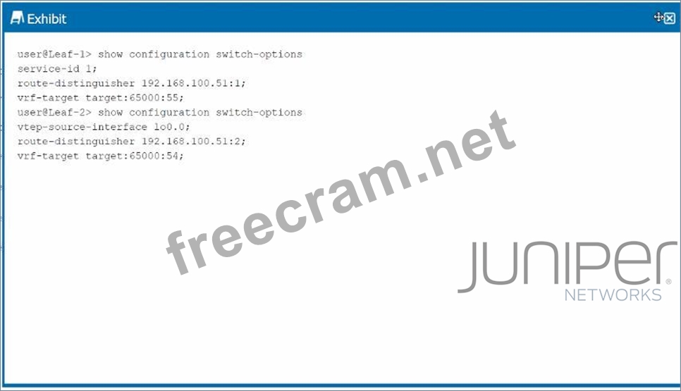 * Review of the Exhibit: * The exhibit shows the switch configuration for Leaf-1 and Leaf-2. The configurations include route distinguishers, VRF targets, and service IDs, all of which are crucial for ensuring proper operation in an EVPN-VXLAN environment. * Service-ID Consistency: * The service ID must be consistent across all participating leaf devices in the same EVPN instance to ensure that they are part of the same VXLAN overlay network. * VRF Target Consistency: * The vrf-target parameter must also be consistent across devices to ensure that VRFs (Virtual Routing and Forwarding instances) are correctly imported and exported between leaf nodes. Conclusion: * Option B:Correct-Setting the same service-id on Leaf-2 ensures that it is part of the same VXLAN overlay as Leaf-1. * Option D:Correct-The vrf-target on Leaf-2 should match Leaf-1 to ensure consistent routing policies and proper route exchange.