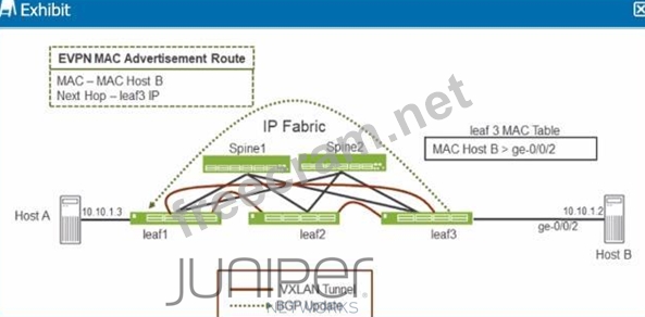 * Scenario Overview: * In the exhibit, Host A is trying to resolve Host B's IP address (10.10.1.2) through ARP (Address Resolution Protocol). Normally, an ARP request would be broadcasted over the network, and the host owning the IP address (Host B) would respond. * Role of Proxy ARP: * Option A:Proxy ARPallows a router or switch (in this case, leaf1) to respond to ARP requests on behalf of another host. Leaf1, knowing the MAC address of Host B through the EVPN MAC advertisement, can reply to Host A's ARP request directly without broadcasting the request across the entire network fabric. This feature reduces unnecessary traffic and increases network efficiency. Conclusion: * Option A:Correct-Proxy ARP enables leaf1 to respond to Host A's ARP request for Host B's IP without broadcasting over the IP fabric, thus providing the ARP response locally.