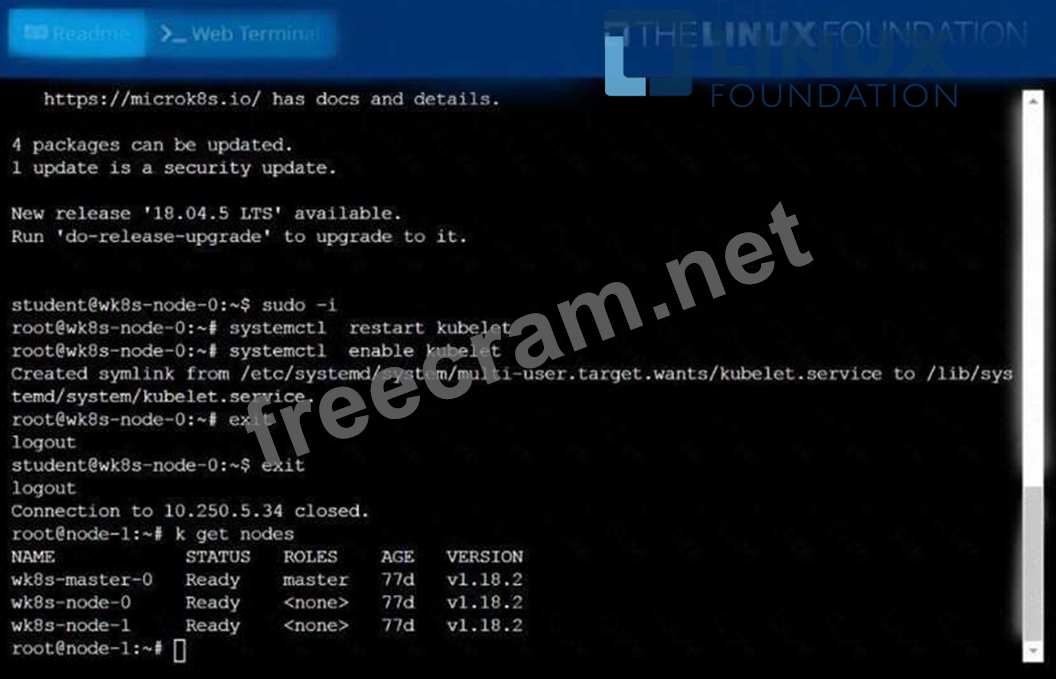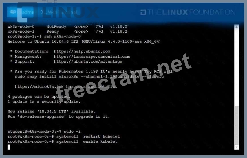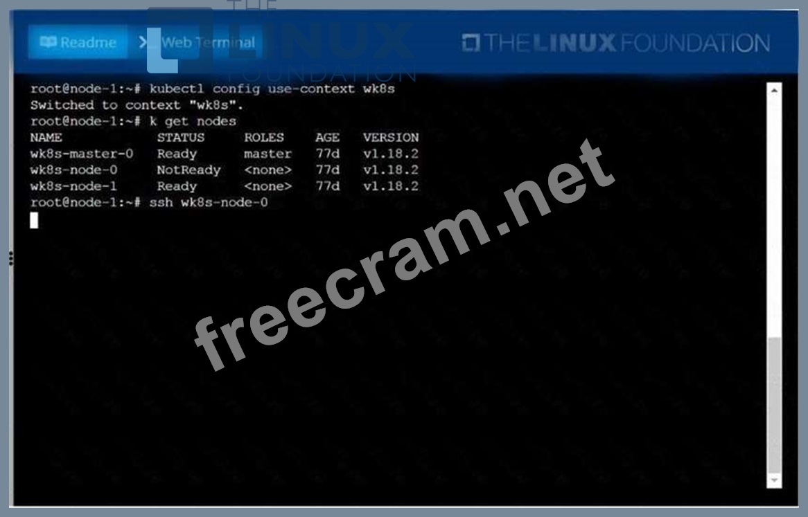 A Kubernetes worker node, named .Investigate why this is the case, andperform any appropriate steps tobring the node to a state,ensuring that any changes are madepermanent. You cansshto the failednode using: [student@node-1] $ | sshWk8s-node-0 You can assume elevatedprivileges on the node with thefollowing command: [student@w8ks-node-0] $ |sudo -i