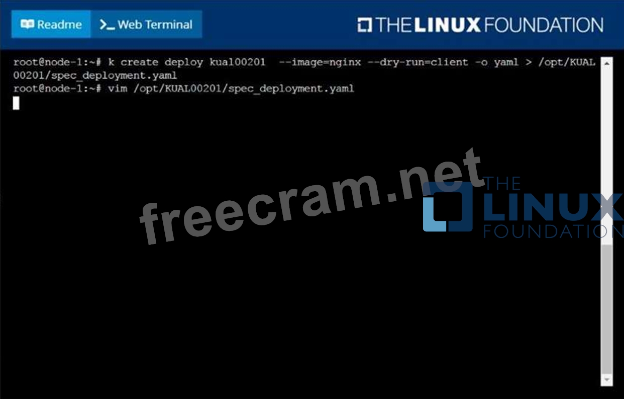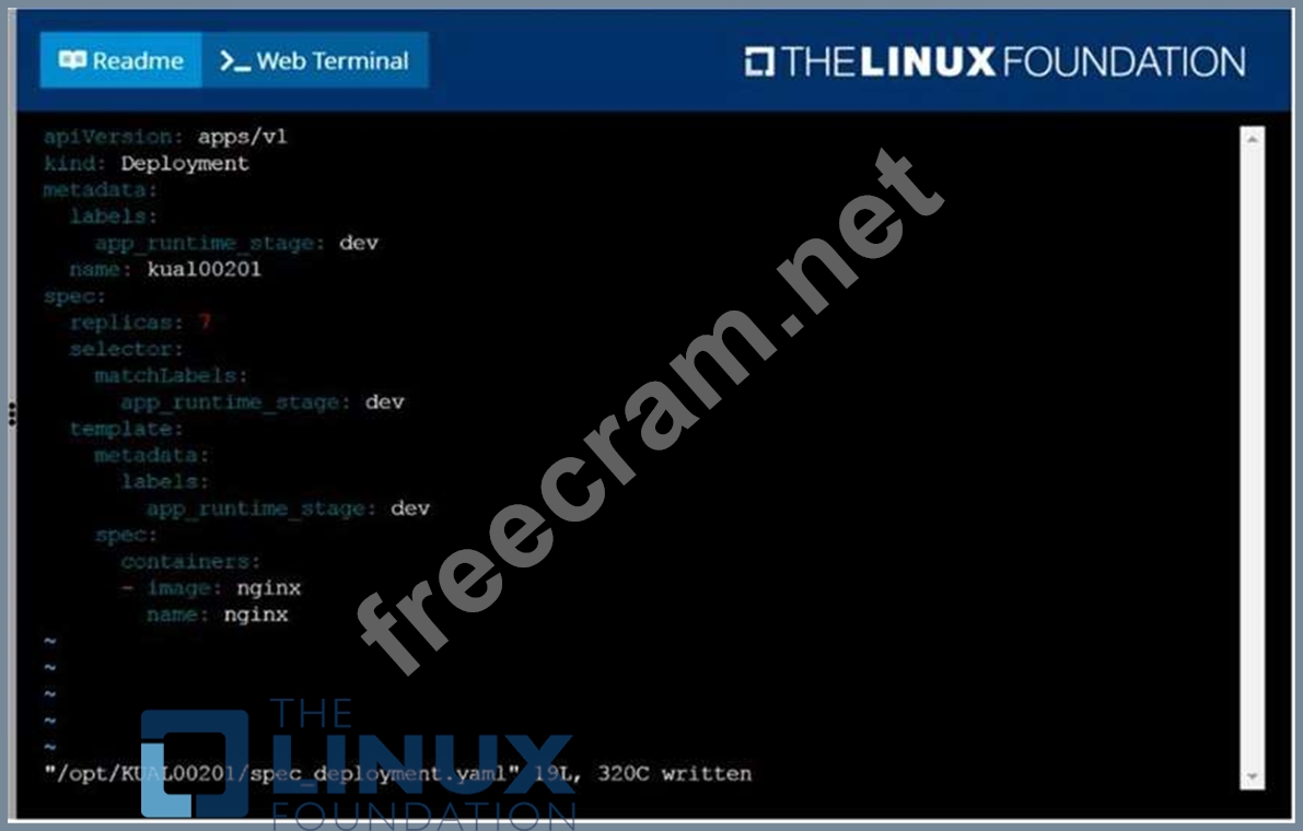 Create a deployment spec file that will: Launch 7 replicas of the nginx Image with the labelapp_runtime_stage=dev deployment name: kual00201 Save a copy of this spec file to /opt/KUAL00201/spec_deployment.yaml (or /opt/KUAL00201/spec_deployment.json). When you are done, clean up (delete) any new Kubernetes API object that you produced during this task.