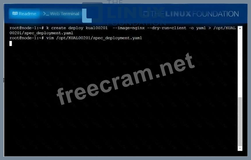 Create a deployment spec file thatwill: * Launch 7 replicas of thenginxImage with the labelapp_runtime_stage=dev * deployment name:kual00201 Save a copy of this spec file to/opt/KUAL00201/spec_deployment.yaml (or/opt/KUAL00201/spec_deployment.json). When you are done, clean up (delete)any new Kubernetes API object thatyou produced during this task.