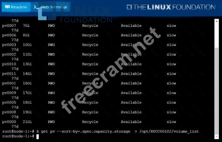 /opt/KUCC00102/volume_list. Use kubectl 's own functionality for sorting the output, and do not manipulate it any further.