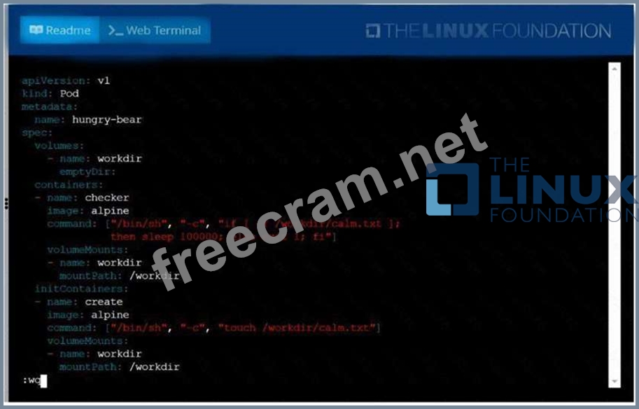 Perform the following tasks: * Add an init container to hungry-bear (which has been defined in spec file /opt/KUCC00108/pod-spec-KUCC00108.yaml) * The init container should create an empty file named/workdir/calm.txt * If /workdir/calm.txt is not detected, the pod should exit