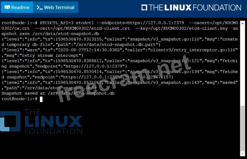 Create a snapshot of the etcd instance running at https://127.0.0.1:2379, saving the snapshot to the file path /srv/data/etcd-snapshot.db. The following TLS certificates/key are supplied for connecting to the server with etcdctl: CA certificate: /opt/KUCM00302/ca.crt Client certificate: /opt/KUCM00302/etcd-client.crt Client key: Topt/KUCM00302/etcd-client.key