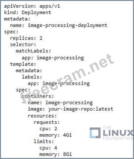 2. Define Resource Requests and Limits: - Set resource requests and limits for your image processing containers- Requests define the minimum resources that each container needs to run smoothly, while limits define the maximum resources it can consume. This ensures that the service doesn't starve other workloads on the cluster and doesn't consume excessive resources. 3. Implement Horizontal Pod Autoscaling (HPA): - Configure HPA to automatically scale tne number of pods based on CPU or memory utilization. This enables the service to scale up during peak periods and scale down during low utilization to optimize resource usage. 4. Use Resource Quotas: - Implement Resource Quotas at the namespace level to limit the total resources that can be consumed by the image processing service and its associated workloads. This helps prevent resource starvation for other applications within the same namespace. 5. Utilize Node Affinity and Tolerations: - Apply node affinity and tolerations to schedule the image processing service on nodes that have the necessary resources (like GPLJs or high- performance CPUs) to efficiently handle image processing tasks- 6. Consider Using GPU Resources: - If your image processing tasks involve heavy computations, consider leveraging GPUs for accelerated processing. You can configure Kubernetes to schedule pods with GPU resources, ensuring that the image processing service nas access to tne necessary hardware for optimal performance.