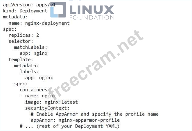 4. Restart the Pods: - Apply the updated Deployment YAML using 'kubectl apply -f nginx-deployment.yaml' - The updated deployment will restart the pods with the new AppArmor profile. 5. Verify the Profile: - Check the status of the pods with 'kubectl describe pod - Look for the "Security Context" section and verify that the AppArmor profile is correctly applied. 6. Test the Restrictions: - Try to access files or directories that are not allowed by your AppArmor profile. - This will help you confirm that the profile is effectively restricting access.