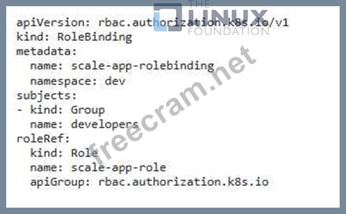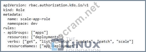 3. Apply the configuration: - Apply the Role and Role8inding using the following commands: bash kubectl apply -f scale-app-role.yaml kubectl apply -f scale-app-rolebinding-yaml 4. Verify the configuration: - You can verify the configuration by using the following command: bash kubectl auth can-i --list --as=user:testuser--group-developers--namespace-dev - Replace 'testuser' with the name of a user in the 'developers' group. The output should show only the following permissions: - 'apps/deployments': 'get, "list, 'watch', 'update', 'patch', 'scale' 5. Test the permissions: - Try to scale the Sapp-deployment deployment using the 'kubectr command as a user in the 'developers group. - Try to perform other actions on the deployment or other resources in the 'devs namespace. You should only be able to scale the Sapp-deployment deployment.