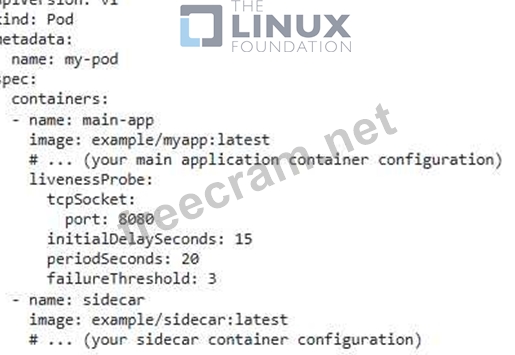 - specifies a TCP port to check. - 'initialDelaySeconds:' sets the delay before the first probe. - 'periodSeconds:' determines the frequency of health checks. - 'tailureThreshold:' specifies the number of consecutive tailed probes before restarting the container 3. Create the sidecar container: Design a sidecar container that monitors tne main containers health status. This container can be responsible for: - Observing health check results: Receive health check results from the main container. - Taking corrective actions: It the main container becomes unhealthy, the sidecar cam - Restart the main container: Use Kubernetes restart policy or 'execs commands to restart the main container. - Send alerts: Integrate with a monitoring system to send alerts about the main container's health issues. 4. Implement sidecar logic: Implement the necessary logic in the sidecar container to handle the health checks, perform corrective actions, and potentially interact witn a monitoring system. bash # Sidecar Dockerfile FROM ubuntu:latest # (add your monitoring and restart logic) # Start a process to periodically check main application container health CMD ["sh", "-c", "while true; do sleep 20; curl -s http://main-app:8080; exit 0; done"] 5. Test and monitor: Test the Pod's functionality by simulating a health issue in the main container. Ensure the sidecar container successfully identifies the issue and takes corrective actions. Monitor logs from both containers to validate the health check process and sidecar containers actions. This approach uses the sidecar container to monitor the health of the main application container, effectively managing the application's health and ensuring responsiveness to potential failures. ,
