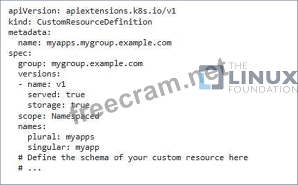 3. Apply the Resources: - Apply the CRD, Role, and Role3inding to your Kubernetes cluster using kubectl: bash kubectl apply -f crd.yaml kubectl apply -f role.yaml kubectl apply -f rolebinding.yaml 4. Test the Security' - Now, try creating a custom resource instance. Only the authorized users or groups will be able to create or modify instances of this CRD. - This configuration defines a custom resource that allows only authorized users to interact With it. - The Role grants specific permissions, and the RoleBinding links the Role to specific users or groups. - By defining appropriate roles and rolebindings, you can enforce granular access control on your custom resource and ensure only authorized users can create or modify CRD instances. ,