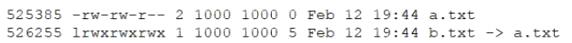 This command will create a new file b.txt that has a different inode number than a.txt (Inode 526053), and contains the path to a.txt. The output of the ls -i command will show something like: