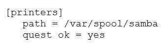In the context of a Samba configuration for printer shares, the [printers] section usually requires the printable = yes directive to indicate that the share is meant for printing. Without this directive, Samba would not treat the share as a printer share, even if other settings like path are configured properly. The given snippet is: The line printable = yes is missing and is essential for defining a printer share. Reference: Samba Official Documentation - Printer Sharing