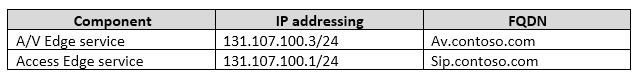 All users are enabled for Enterprise Voice. The company also contains the Edge environment configured as shown in the following table: