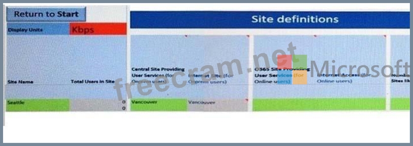 In the Skype for Business Bandwidth Calculator, which options should you select? To answer, select the appropriate branch site or sites in the Skype for Business Bandwidth Calculator. (Note: The three drop- down lists are in the row for Seattle.)