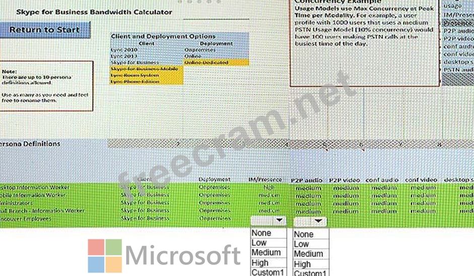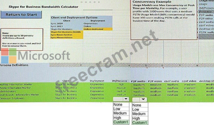 In the Skype for Business Bandwidth Calculator, which options should you select? To answer, select the appropriate value in each drop-down list in the Skype for Business Calculator. (Note: The drop-down lists are in the Persona Definitions section.)