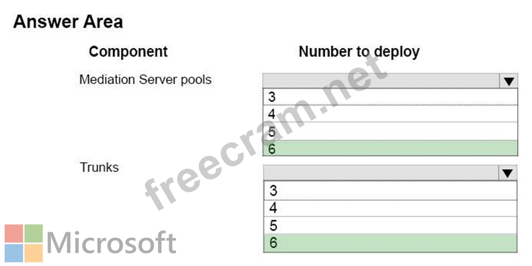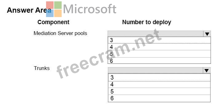 How many of each component should you deploy? To answer, select the appropriate number of Mediation Server pools and trunks from the lists in the answer area.