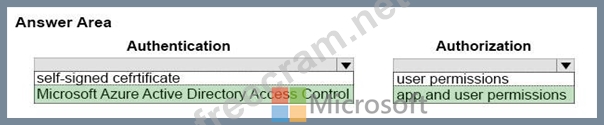 How should you configure authentication and authorization for the app? To answer, select the appropriate option from each list in the answer area.