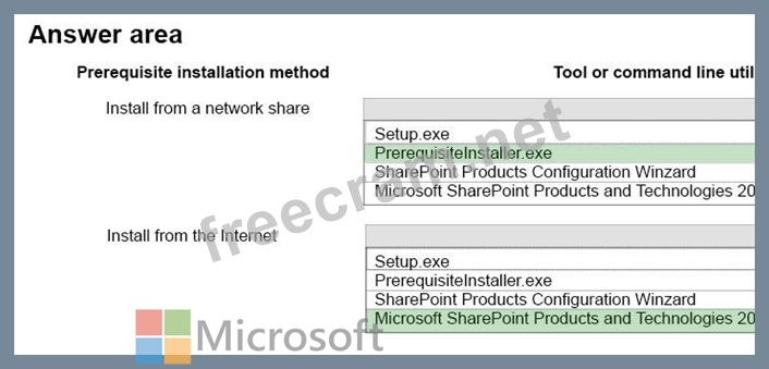 For each prerequisite installation method, which tool or command line utility should you use? To answer, select the appropriate tool or command line utility from each list in the answer area.