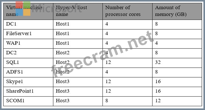You have three Hyper-V hosts that each have 20 processor cores and 64 GB of RAM. Nine virtual machines are deployed to the hosts as shown in the following table.