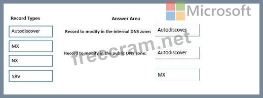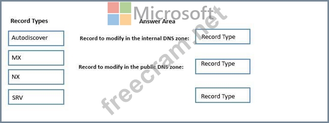 Which DNS records should you modify? To answer, drag the appropriate record types to the correct DNS zones. Each record type may be used once, more than once, or not at all. You may need to drag the split bar between panes or scroll to view content.