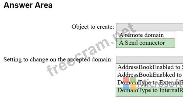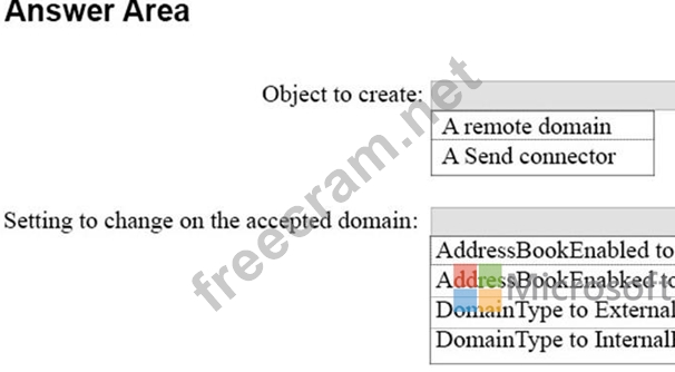 In the Contoso organization, you create an accepted domain for fabrikam.com. You configure the MX records of fabrikam.com to point to the Exchange servers of the Contoso organization. You configure several users in the Contoso organization to have an email address that uses the fabrikam.com SMTP domain.