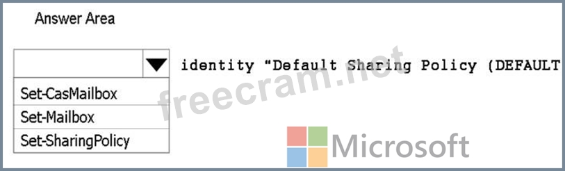 Set-SharingPolicy -Identity Fabrikam -Domains "mail.Fabrikam.com: CalendarSharingFreeBusySimple" References: https://technet.microsoft.com/en-us/library/dd297931(v=exchg.160).aspx