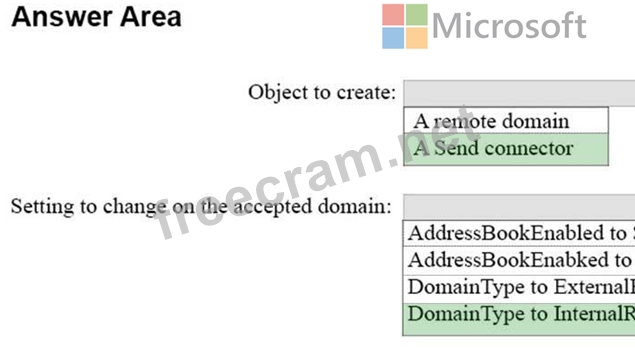 In the Contoso organization, you create an accepted domain for fabrikam.com. You configure the MX records of fabrikam.com to point to the Exchange servers of the Contoso organization. You configure several users in the Contoso organization to have an email address that uses the fabrikam.com SMTP domain.