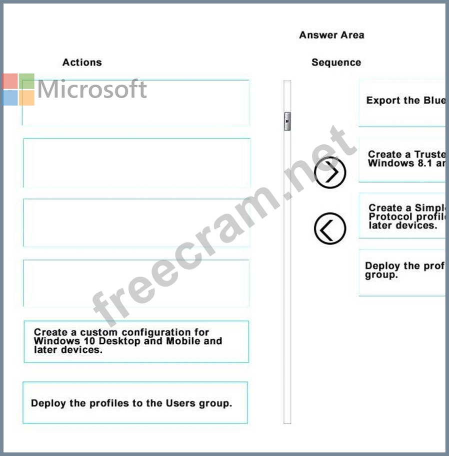 In the Microsoft Intune administration portal, which four actions should you perform in sequence? To answer, move the appropriate actions from the list of actions to the answer area and arrange them in the correct order.