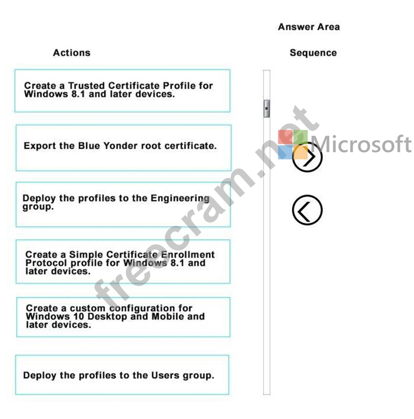 Blue Yonder Airlines has a subscription to Microsoft Intune for Mobile Device Management (MDM). The subscription includes the MDM Authority and Terms and Conditions components. The company has deployed the Network Device Enrollment service, Enterprise Certification Authority, and the Intune Certificate Connector. Blue Yonder Airlines has an on-premises Microsoft Exchange environment.