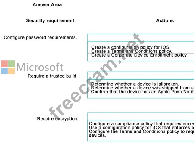 Blue Yonder Airlines has a subscription to Microsoft Intune for Mobile Device Management (MDM). The subscription includes the MDM Authority and Terms and Conditions components. The company has deployed the Network Device Enrollment service, Enterprise Certification Authority, and the Intune Certificate Connector. Blue Yonder Airlines has an on-premises Microsoft Exchange environment.