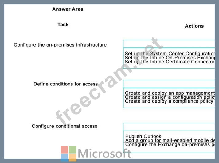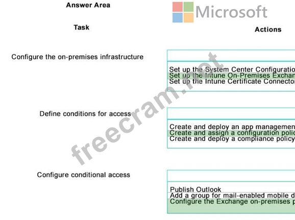 Blue Yonder Airlines has a subscription to Microsoft Intune for Mobile Device Management (MDM). The subscription includes the MDM Authority and Terms and Conditions components. The company has deployed the Network Device Enrollment service, Enterprise Certification Authority, and the Intune Certificate Connector. Blue Yonder Airlines has an on-premises Microsoft Exchange environment.