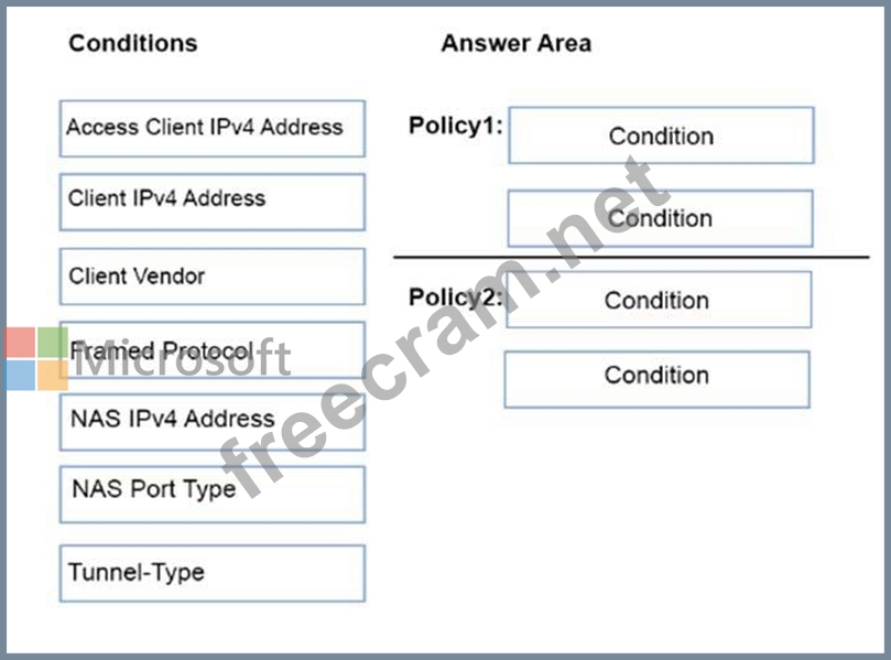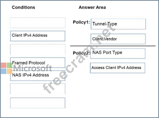 Which conditions should you add to each network policy? To answer, drag the appropriate conditions to the correct network policies. Each condition may be used once, more than once, or not at all. You may need to drag the split bar between panes or scroll to view content.