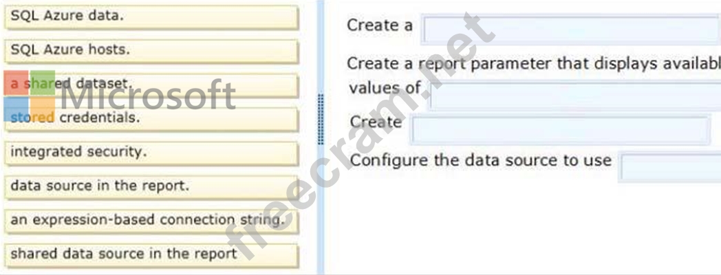 * A data connection includes the data source type, connection information, and the type of credentials to use. There are two types of data sources: embedded and shared. An embedded data source is defined in the report and used only by that report (fits this scenario). A shared data source is defined independently from a report and can be used by multiple reports.