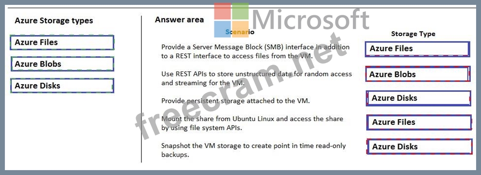 Which Azure Storage types should you use? To answer, drag the appropriate Azure Storage type to the correct target. Each Azure Storage type may be used once, more than once, or not at all. You may need to drag the split bar between panes or scroll to view content.