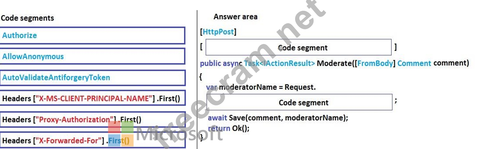 Question 88: DRAG DROP You need to add code to CommentController.cs to en...