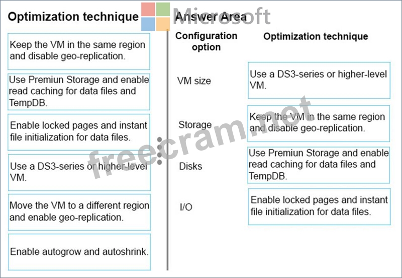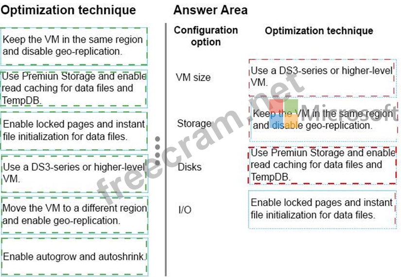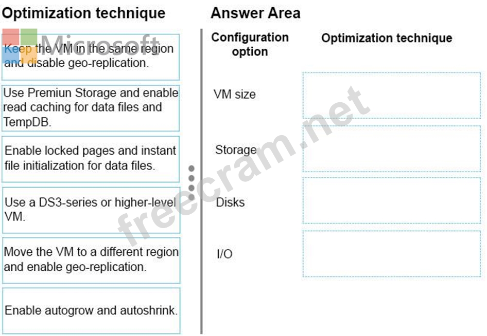 What should you do? To answer, drag the appropriate optimization technique to the correct configuration option. Each optimization technique may be used once, more than once, or not at all. You may need to drag the split bar between panes or scroll to view content.