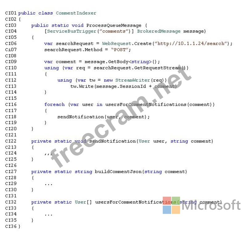 Relevant portions of the CommentIndexer.cs file are shown below. Line numbers are included for reference only and include a two-character prefix that denotes the specific file to which the code belongs.