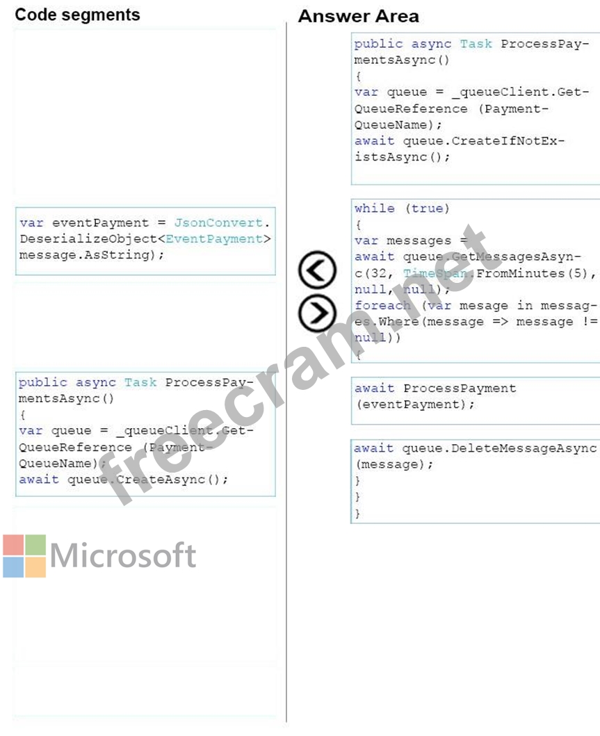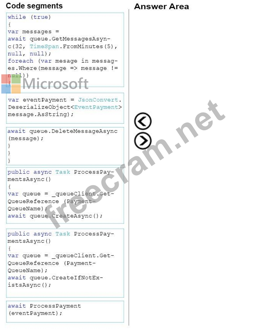 Payment information must be stored by using Azure Queue storage. Connection to the Azure storage