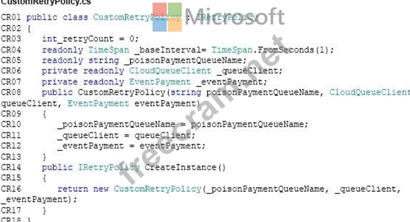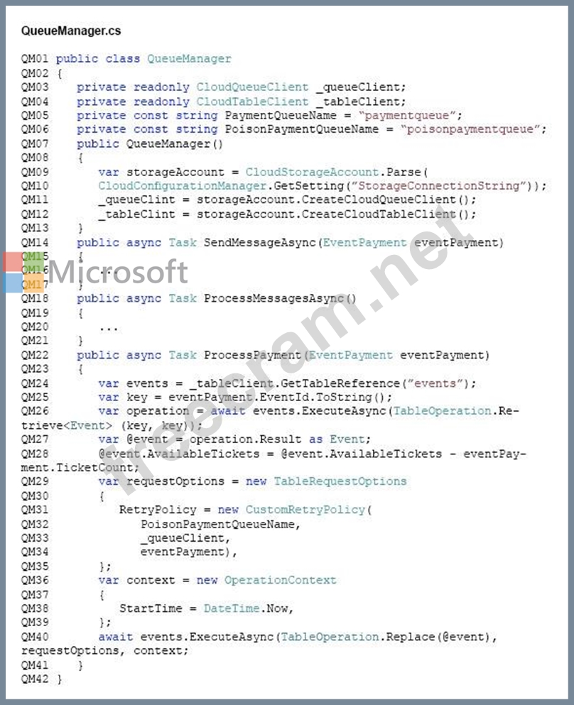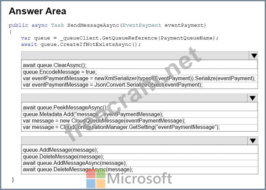 Payment information must be stored by using Azure Queue storage. Connection to the Azure storage