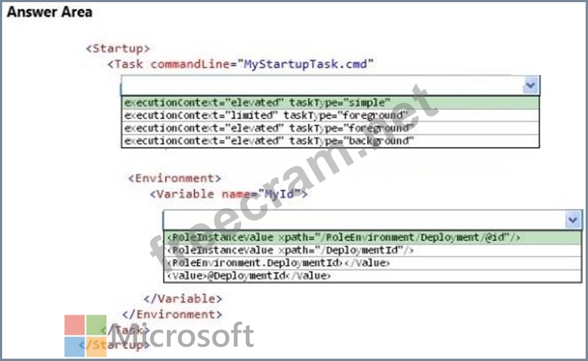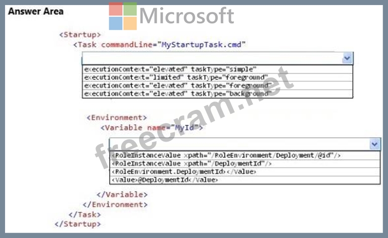 You have a cloud service that runs an external process that is named MyStartupTask.cmd. The cloud service runs this external process when the web role starts. The external process writes information to the Windows registry. You set the value of an environment variable named MyID to the deployment ID for the current web role instance.