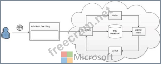 The web role must store documents in blob storage. A SQL database is used to store customer information. The worker role must use queues to process the final tax documents.