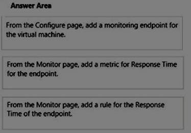 You need to ensure that the VM sends a notification in the event that the average response time for the web service exceeds a pre-defined response time for an hour or more.