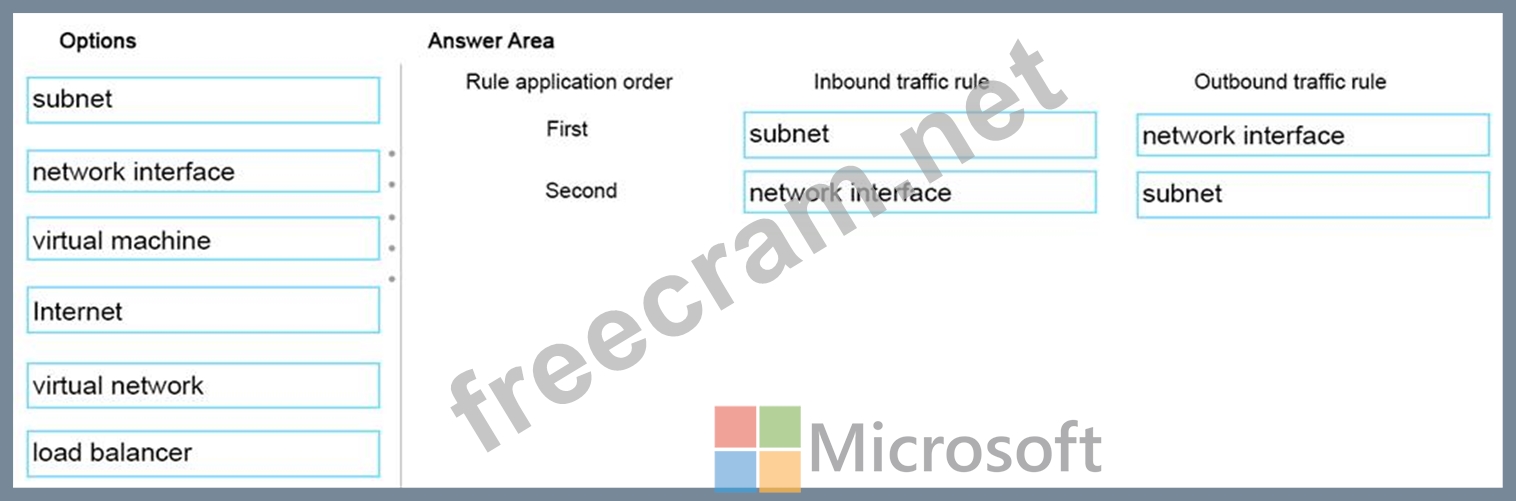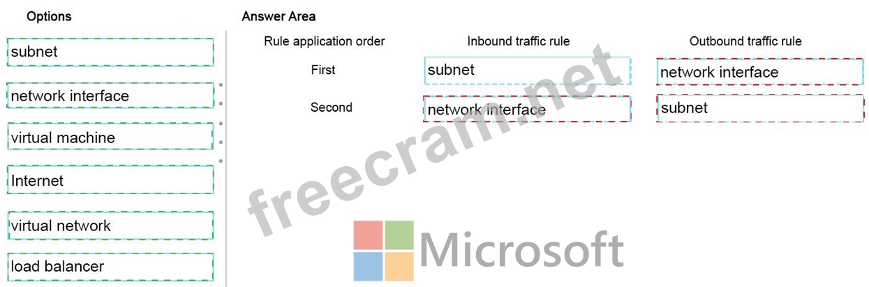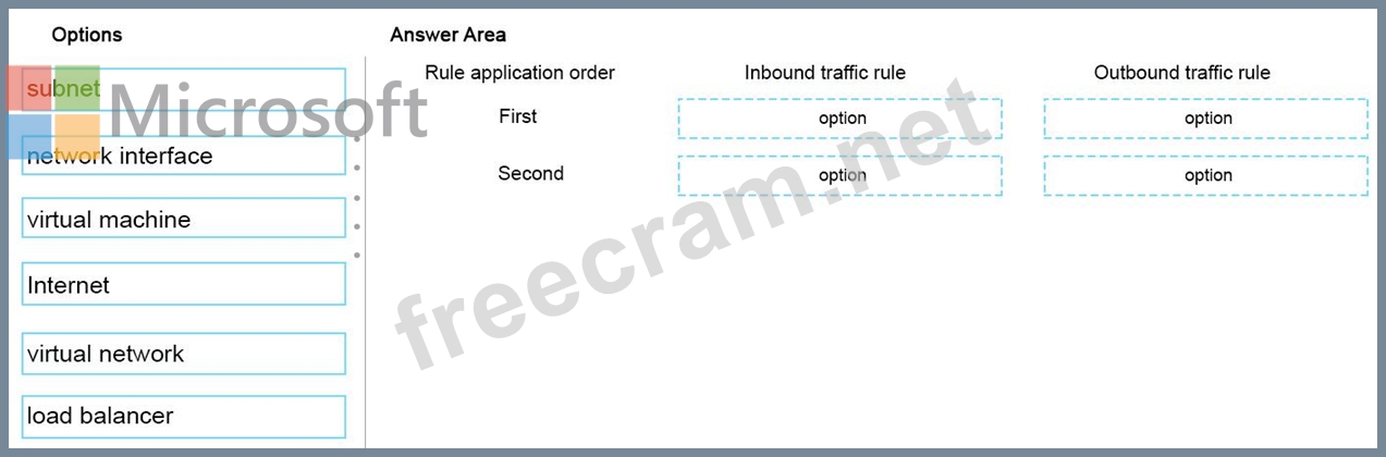 In which order will the rules be applied to the virtual network? To answer, drag the appropriate option to the correct location. Each option may be used once, more than once, or not at all. You may need to drag the split bar between panes or scroll to view content.